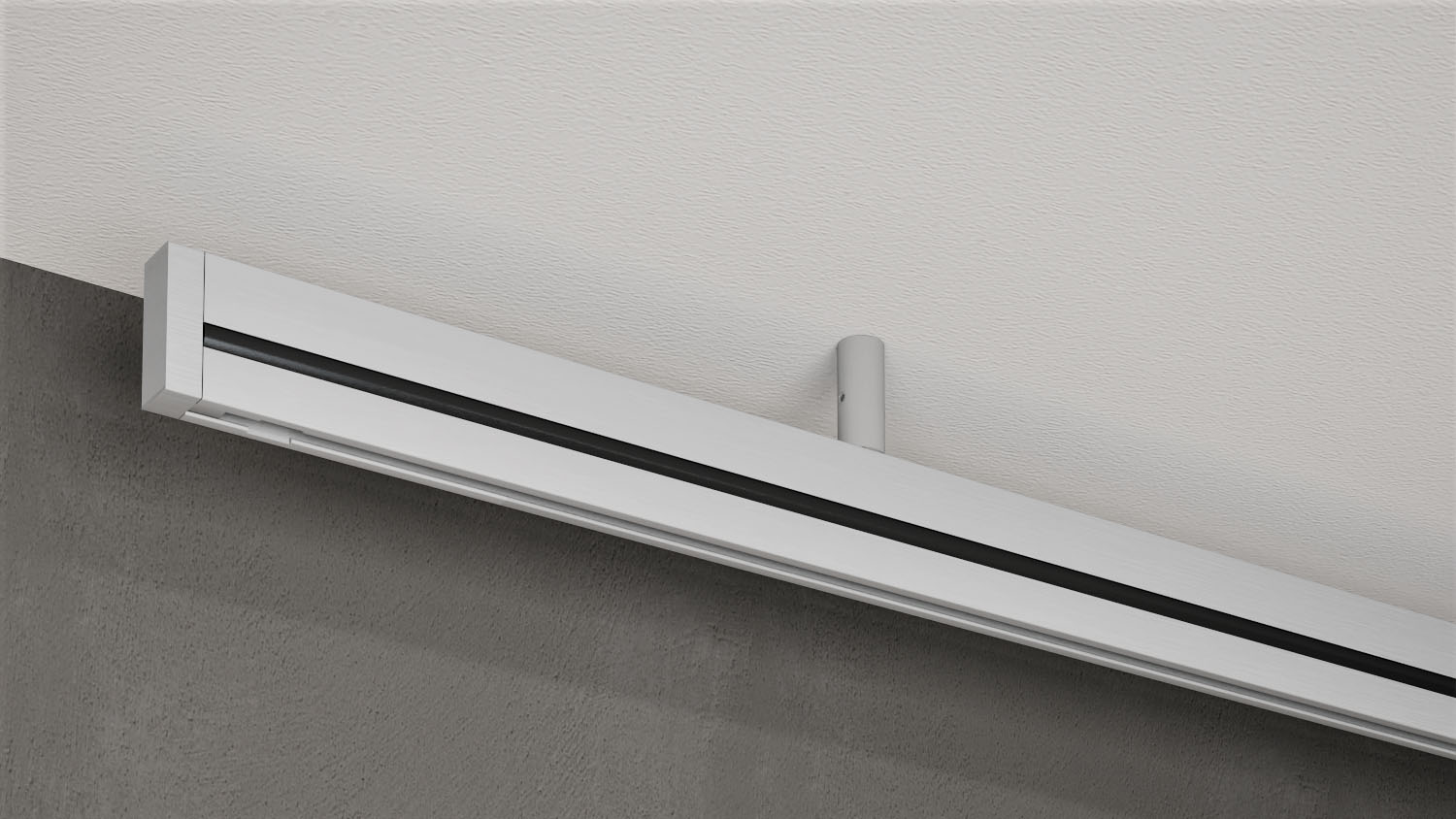 Das Modell 700 vereint zurückhaltende Technik mit einem dekorativen Akzent. Die elegante Dekorschiene eignet sich für Wand- und Deckenmontage und überzeugt durch einen leichtgängigen 6-mm-Laufkanal – kompatibel mit Gleitern und Rollern. Das Highlight: Ein einschiebbares Rundrohr mit Ø 10 mm in Messing oder Schwarz setzt stilvolle Akzente und verleiht der Schiene einen individuellen Look. Auf Wunsch ist das Modell auch mit LED-Beleuchtung erhältlich – für funktionale Ästhetik mit atmosphärischem Licht.
